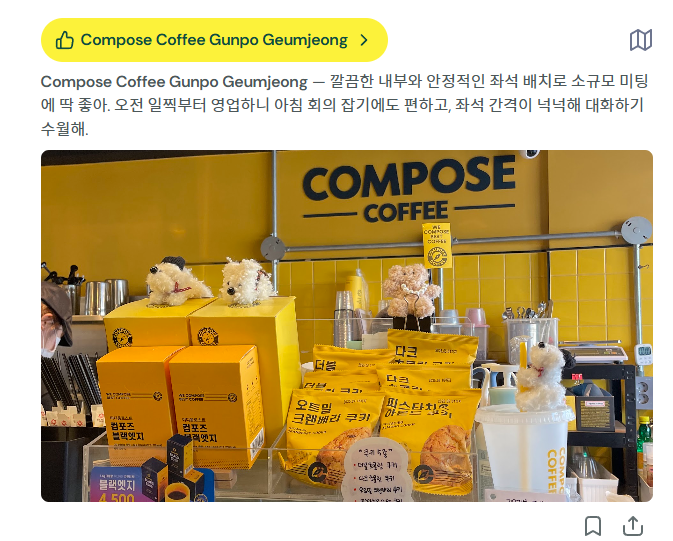 또한 “오늘 밤 갈 만한 라이브 공연 있는 바”, “주말 낮에 갈 수 있는 플리마켓”처럼 이벤트 중심 검색도 가능해, 단순히 장소가 아니라 ‘경험’을 기준으로 지도를 탐색할 수 있습니다. 여행지에 도착해서도 그냥 지도를 켜고 주변 핀만 찍어도 반나절 코스가 자연스럽게 완성되는 흐름입니다.