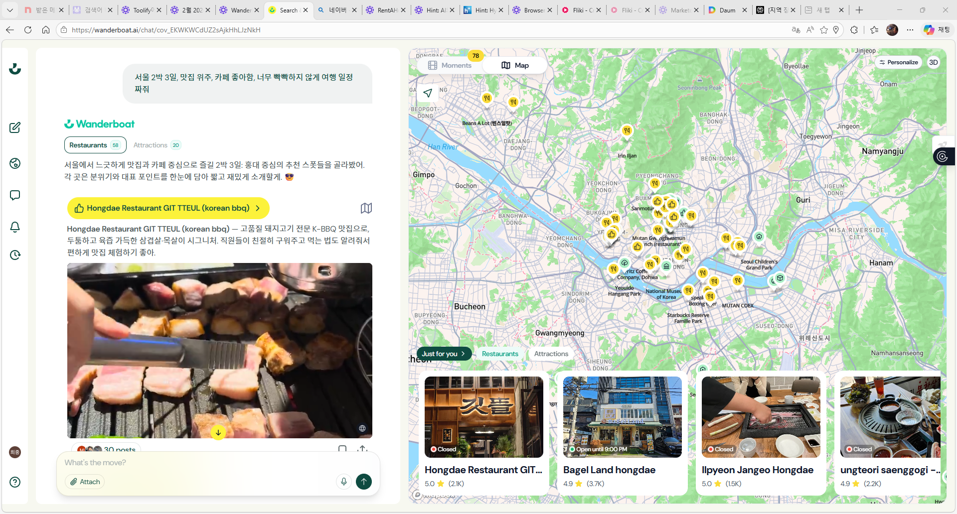 특히 Wanderboat.ai는 인스타그램, 틱톡 같은 소셜 영상까지 분석해서 실제 사람들이 많이 방문하는 로컬 핫플을 찾아내는 게 강점입니다. 단순 광고성 리뷰가 아니라, 실제 방문 영상과 사진이 많이 공유된 곳을 중심으로 추천해 주기 때문에 현지인들이 자주 가는 맛집과 숨은 명소를 발견하기 좋습니다. 여행자 입장에서는 짧은 일정 안에 “실패 없는 선택”을 하기 훨씬 쉬워지는 셈입니다.