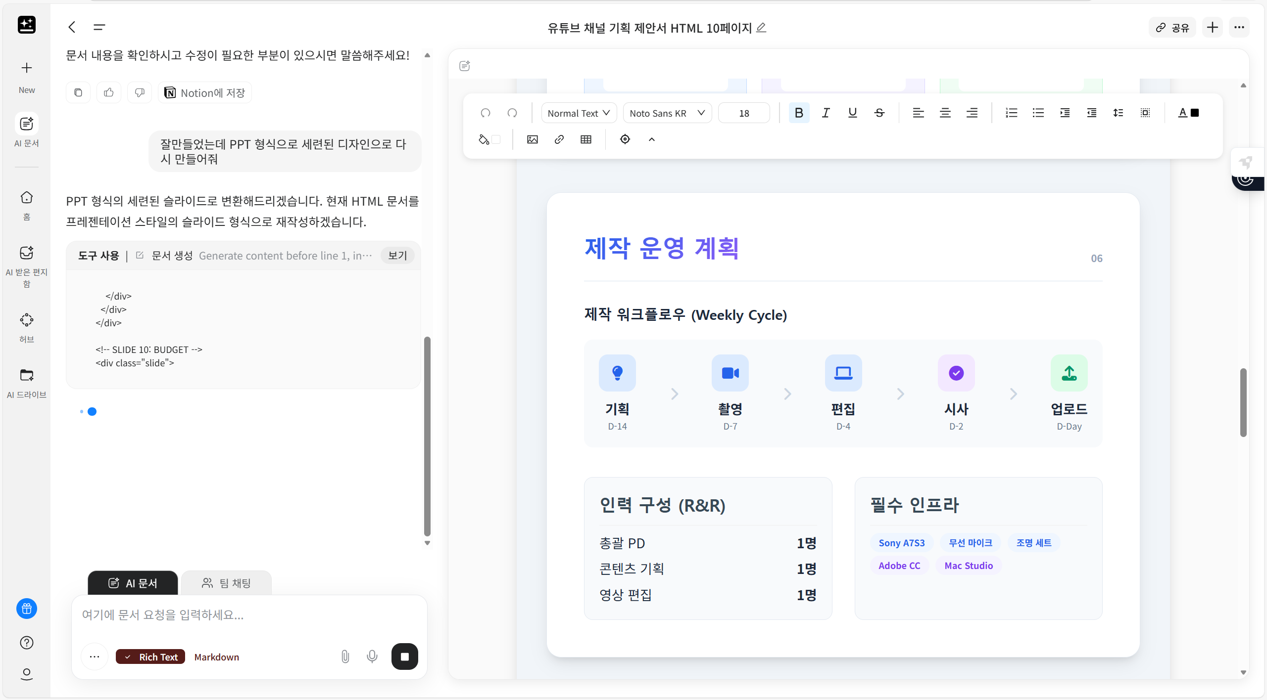 평소 프레젠테이션 만들 때마다 "이 슬라이드 왜 이렇게 구려?" 하며 한두 시간 날려먹었잖아요. 그러다가 결국 답답해서 미리캔버스 혹은 캔바로 가서 한두 시간 찾으면서 고민을 하죠 그런데 Genspark의 AI Slides 기능을 써보니, "유튜브 채널 제안서10장으로 만들어줘" 한 마디에 내용은 기본 너무나 세련된 디자인의 프로급 슬라이드가 뚝딱 만들어집니다. 글씨 깨짐 없이 레이아웃 완벽하고, PPT의 다양한 기능까지 구현 가능하게 만들어져 살아 움직이네요.