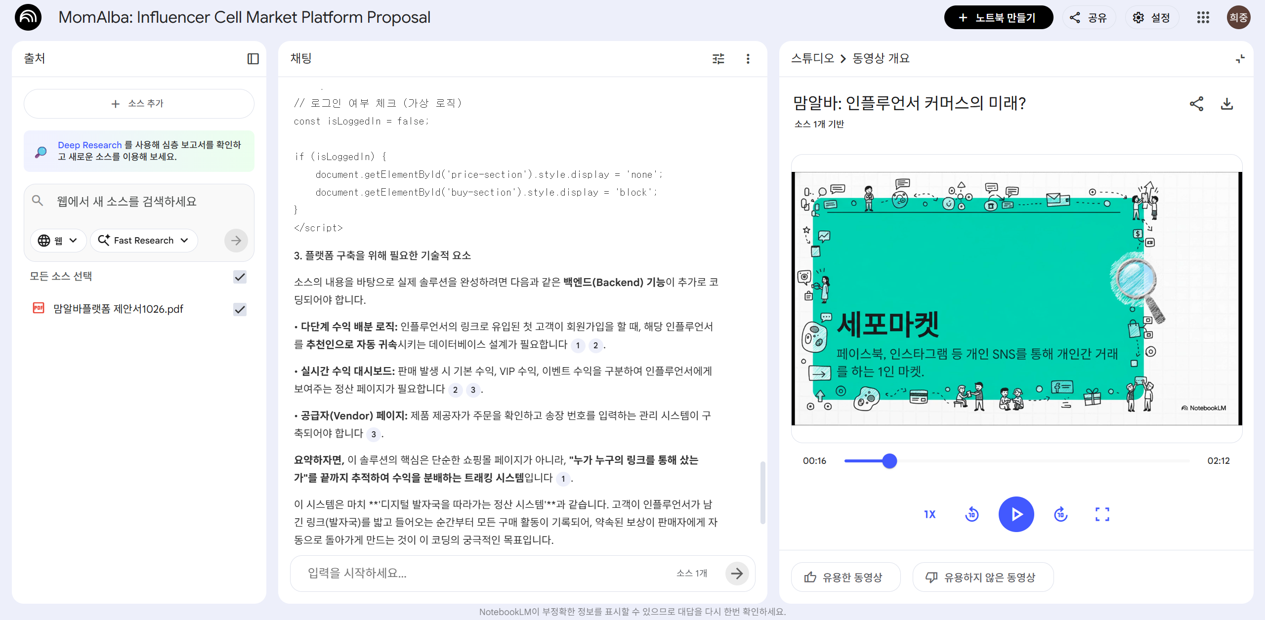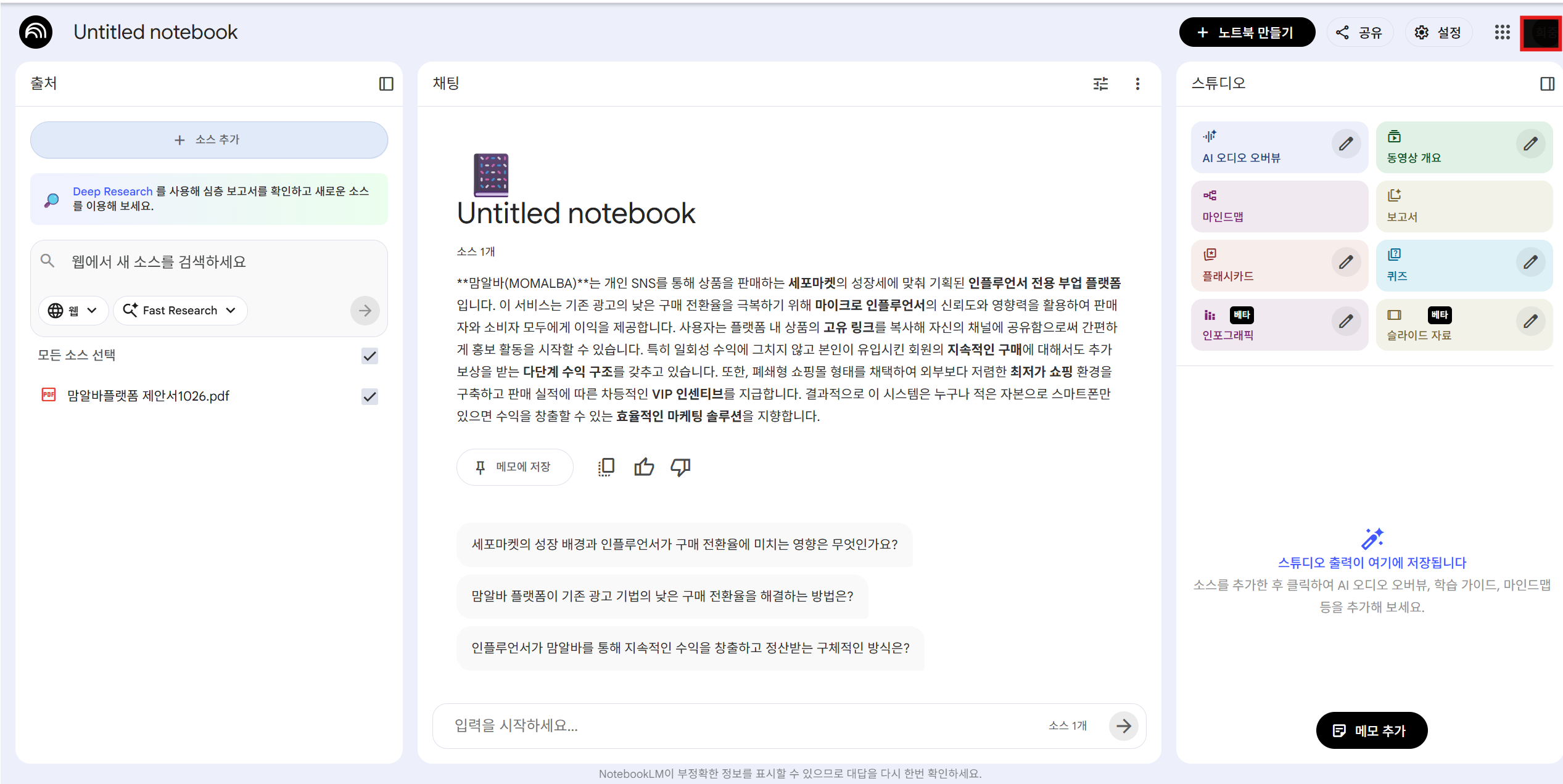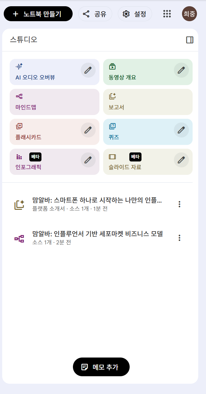단순 요약이 아니라, 자료를 기반으로 마인드맵·팟캐스트·영상까지 뽑아내는 경험은 진짜 소름 돋았습니다.