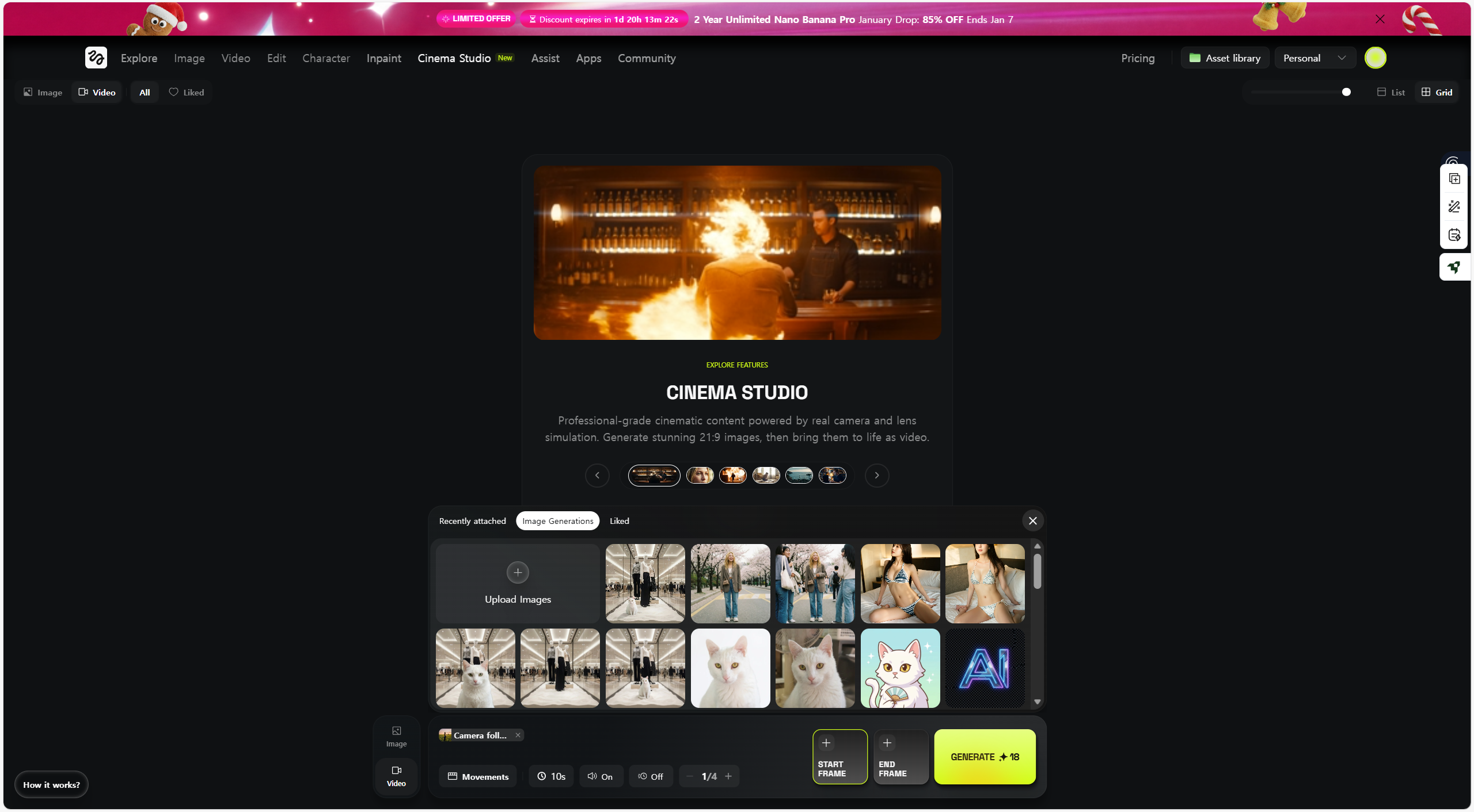 힉스필드 시네마 스튜디오는 처음부터 카메라, 렌즈, 무브먼트 구성까지 시네마 문법을 전면에 내세운다.