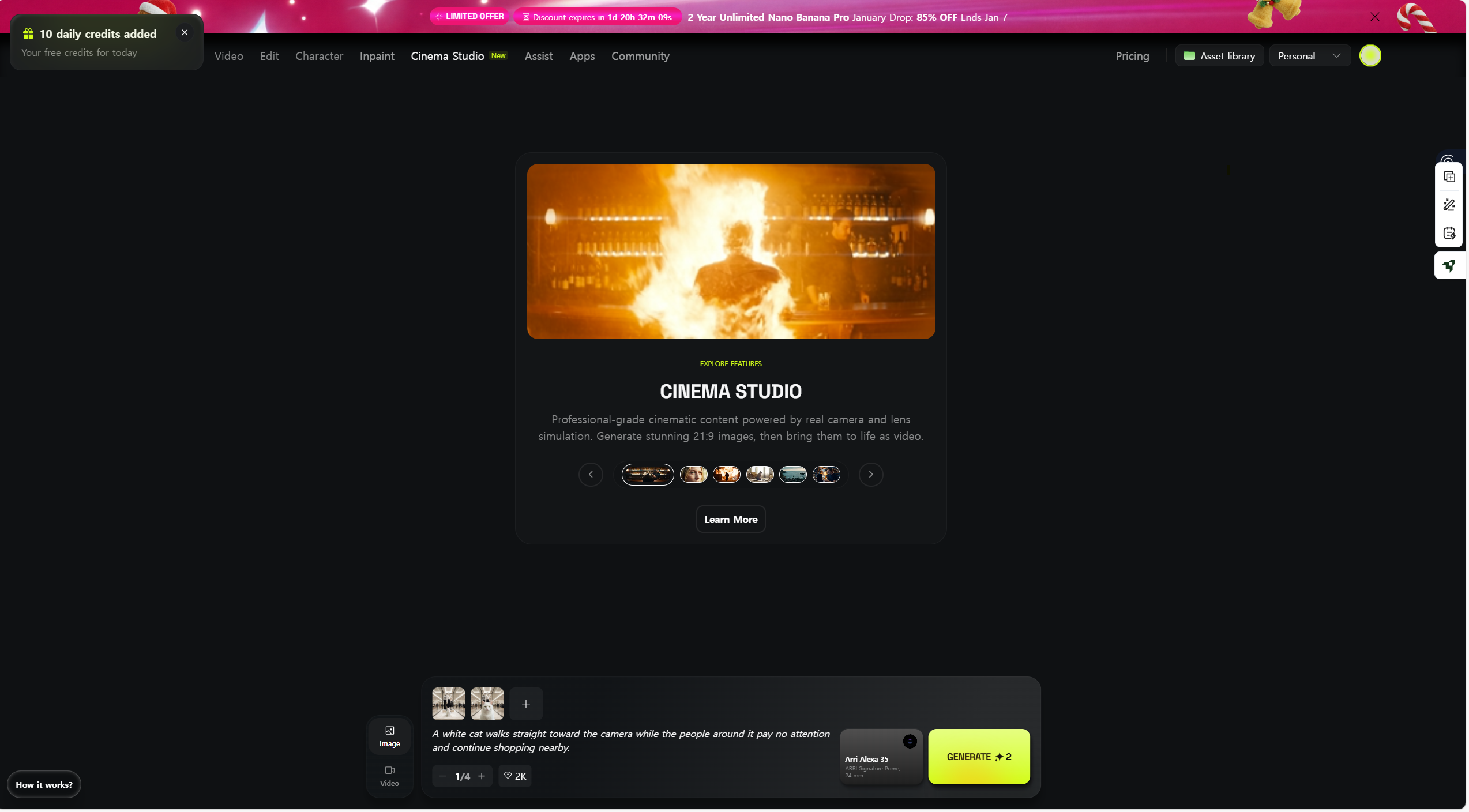 4K 기준으로 이미지 한 장 생성에 4 크레딧이 소모되는데, 기다리는 시간은 생각보다 짧다. 한 번 돌아가고 나면, 이 이미지가 곧 다음 단계의 “세트장”이 된다.