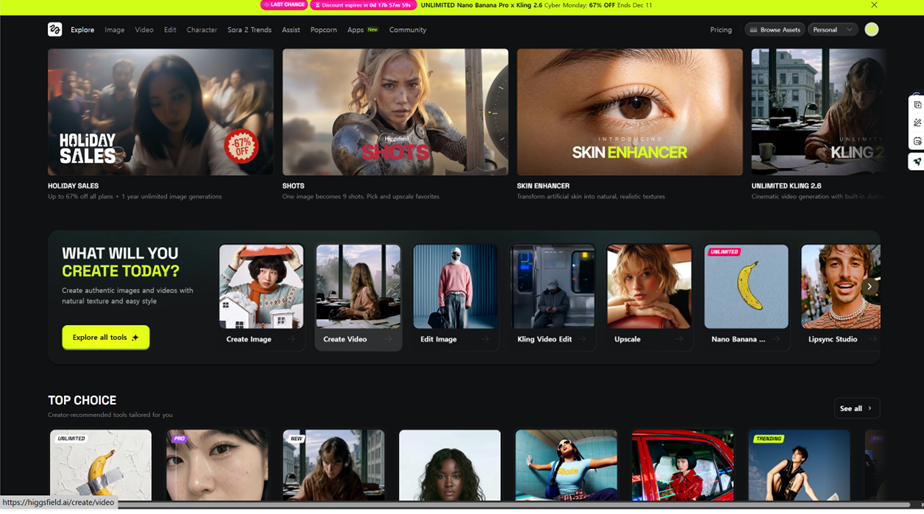 Higgsfield AI는 스마트폰 하나로 할리우드급 영상을 만듭니다. 셀카 변환, 시네마틱 카메라, 실시간 모션까지 – 누구나 디렉터가 되는 시대입니다. 시간과 비용을 아끼고 싶은 모든 콘텐츠 제작자분들께 강력 추천합니다!