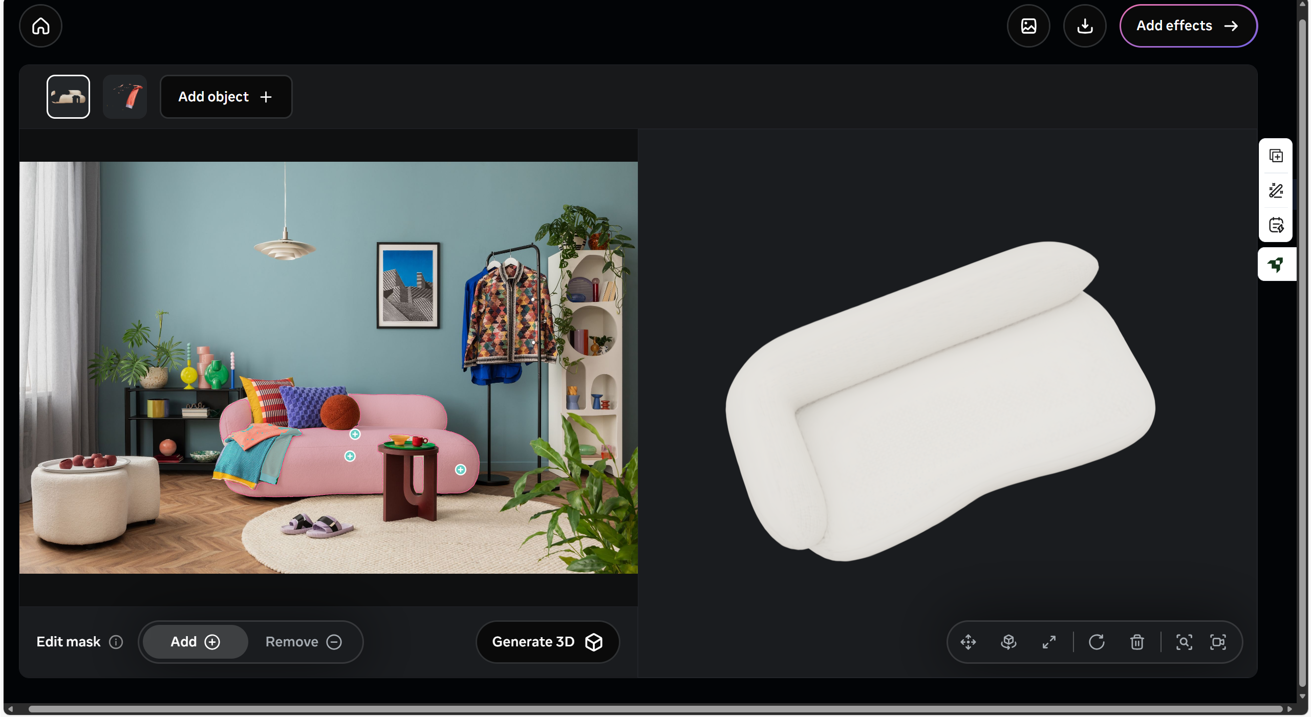- 이미지에서 3D로 만들고 싶은 부분을 클릭하거나 마스크로 지정하면, 그 영역만 따로 3D 오브젝트로 분리해서 생성할 수 있습니다.